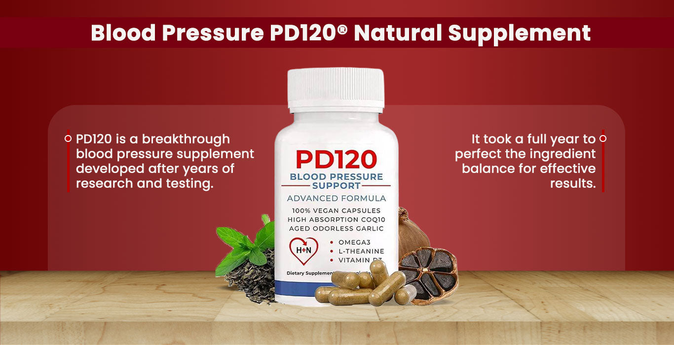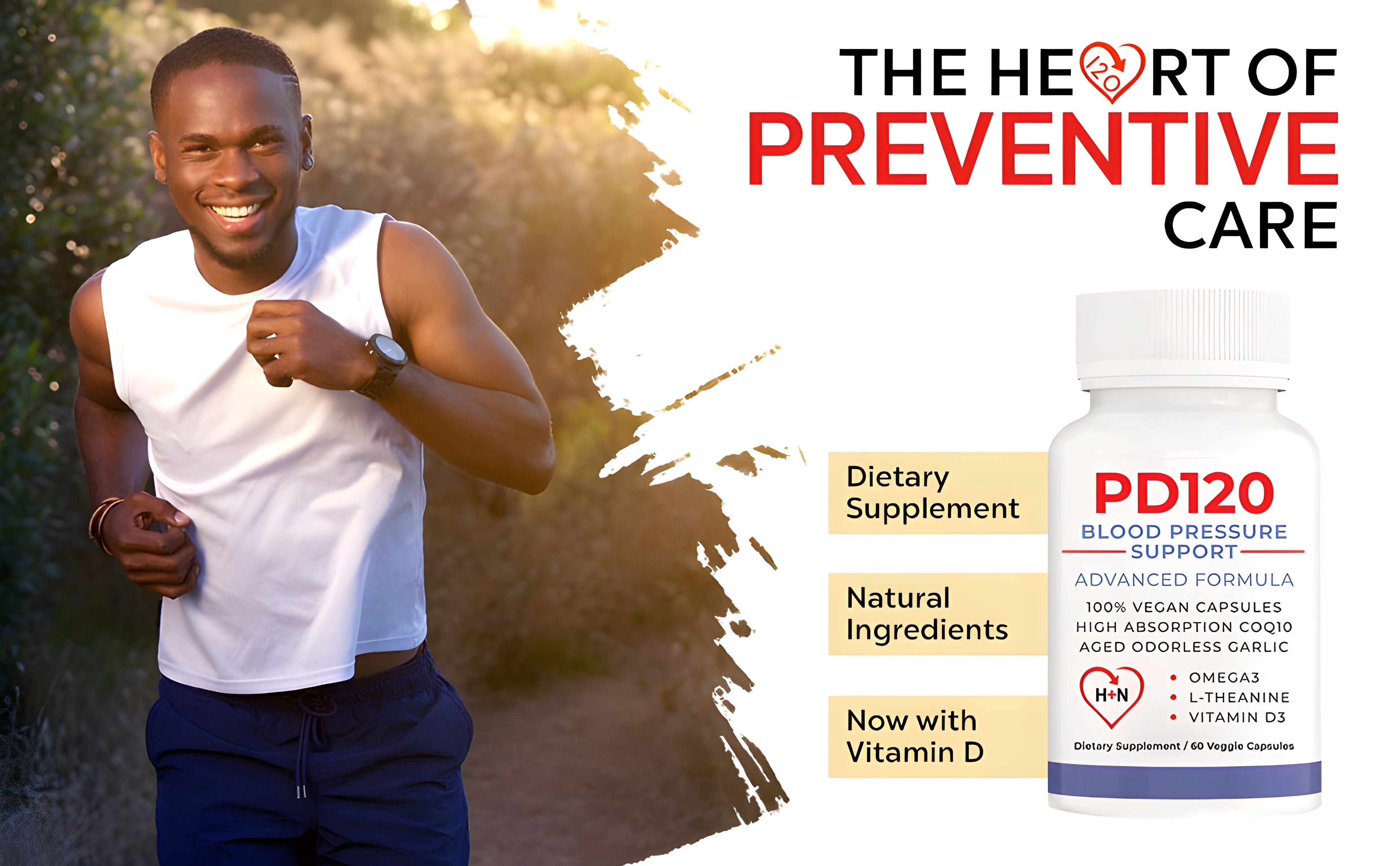 Support your heart health naturally with PD120® — a powerful blend of Black Garlic, CoQ10, Hawthorn Berry, Beet Root, and Omega-3 designed to help maintain healthy blood pressure and overall wellness.